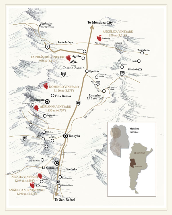 A família Catena desenvolveu uma profunda investigação acerca dos solos e micro-climas das zonas altas de Mendoza, ao pé da Cordilheira. Em altitudes diferentes, cada vinhedo de Catena desenvolve um perfil único de aromas e sabores: sabores de ameixa madura e textura sedosa, no caso do vinhedo Angélica (860 m); pequenos frutos negros e notas de pimenta, no caso do vinhedo La Pirámide (940 m); cerejas negras e excelente estrutura, no caso do vinhedo de Nicasia (1.160m); explosivas notas florais e paladar concentrado, no caso do vinhedo Adrianna (1.500 m). O corte destes componentes dá lugar a um vinho de caráter único com equilíbrio, concentração e de grande identidade varietal.