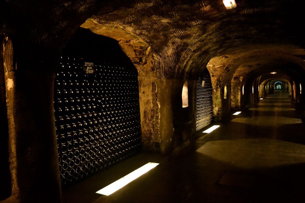 No dia seguinte visitamos a globalmente renomada Moët & Chandon. Situada no centro de Epernay, mostra logo de cara que não estamos visitando uma família ou propriedade, mas sim adentrando um império corporativo. A empresa, que hoje faz parte do conglomerado LVMH, dona de marcas como Louis Vuitton, TAG Heuer, Givenchy e outras marcas de Champagne como, não se espante, a concorrente Veuve Clicquot, lhe recebe como se você estivesse visitando o escritório central de uma multinacional. Atendentes muito bem vestidas e treinadas colocam em operação seu discurso memorizado para lhe recepcionar da forma mais educada e política possível (mas não espere muito calor humano ou espontaneidade… isso não faz parte do protocolo). Após uma rápida aula de história sobre as famílias Moët e Chandon que, através do matrimônio de seus rebentos, chegaram ao nome familiar que conhecemos hoje, partimos para conhecer a cave da propriedade que se estende por quilômetros abaixo da cidade. Ouvi falar em cerca de 100km de caves, extensão formada pela conexão das caves de cada um dos diversos produtores da cidade. Ao final da visita, que dura cerca de uma hora, somos conduzidos a uma sala de degustação, ainda no subsolo da propriedade, onde é possível degustar os cuvées brut, rosé, vintage brut e vintage rosé, dependendo do tipo de ingresso adquirido no início da visita.