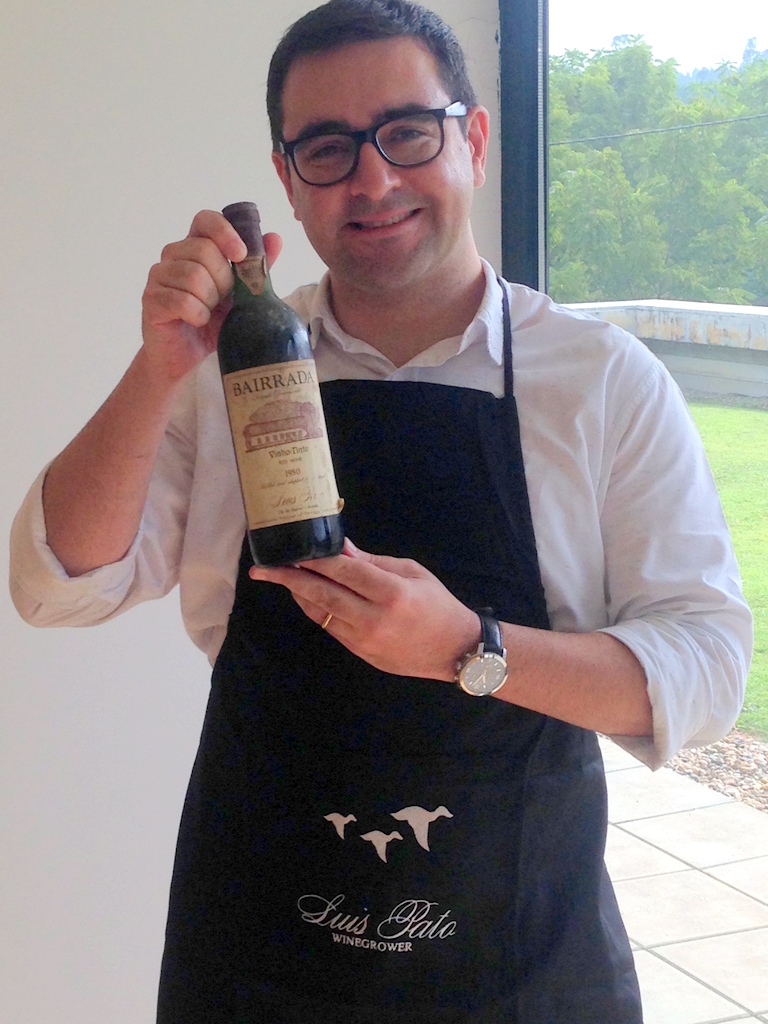 Ao chegar, fui recebido pelo próprio Luis Pato, pessoa muito amável e simpática. Conversamos rapidamente sobre a safra de 2016, que estava em plena vindima, e o Sr. Pato citou um fato curioso: disse que todos os anos terminados com 6 são difíceis. 2016 não estava sendo diferente. Em seguida, Maria João, uma das adoráveis filha do Sr. Pato, e irmã de Filipa Pato, que também vem produzindo elegantes vinhos na região, conduziu o tradicional tour pelas salas de fermentação, barricas e pela prova de alguns rótulos. Durante a visita, fui cortejado com uma fotografia ostentando uma garrafa da safra de 1980, ano do meu nascimento e primeira safra de Luis Pato, época onde seu portfólio se resumia a apenas um rótulo. Infelizmente o presente incluía apenas a fotografia (que será utilizada em futuras publicações da vinícola) e não a degustação da safra histórica, o que de qualquer forma não deixou de tornar a visita menos especial e marcante.